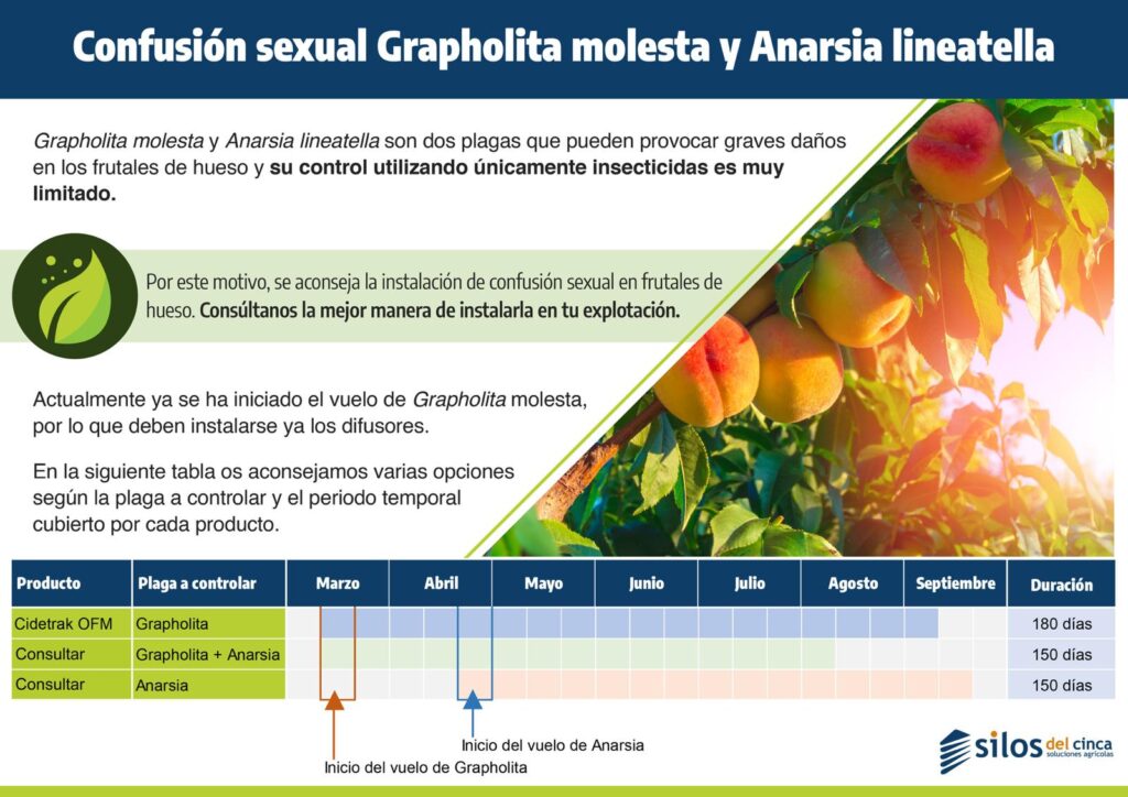 Algunas plagas muy conocidas en frutales de hueso, como la anarsia y la grafolita, se reproducen porque las hembras emiten feromonas que atraen a los machos. Cuando los machos localizan a las hembras, se aparean y la plaga continúa desarrollándose.